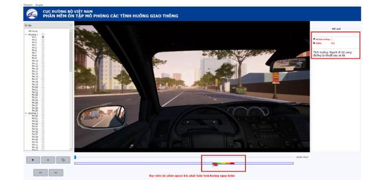 - Nhấn nút Play để bắt đầu thi thử . Lúc này bạn sẽ có 10 tình huống chạy liên tục, giữa các tình huống sẽ có thời gian 10s đếm ngược để chuẩn bị, nhiệm vụ của bạn là quan sát từng tình huống và nhấn phím SPACE.