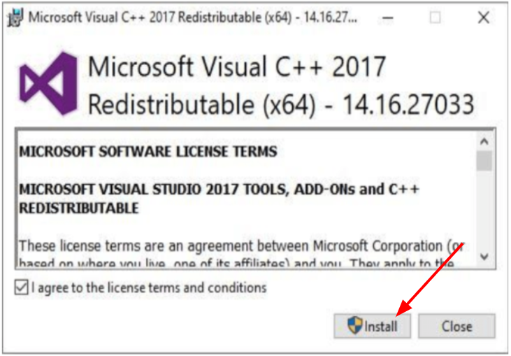Bước 6: Đánh dấu đồng ý tại hộp thoại hiện ra, sau đó nhấn nút “Install” để bắt đầu cài đặt phần mềm “Microsoft Visual C++ 2017 Redistributable“.