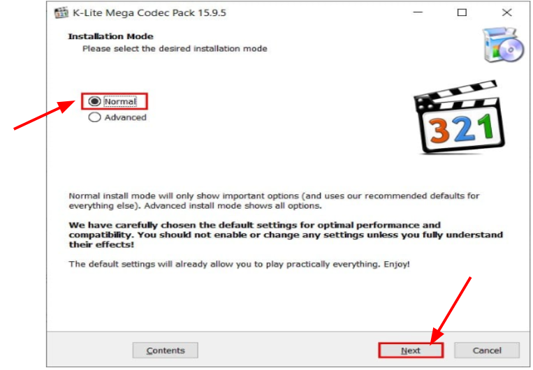 Bước 7: Hộp thoại cài đặt phần mềm “K-Lite Codec Pack” sẽ được hiện ra. Bạn chọn “Normal“, sau đó nhấn “Next” để bắt đầu quá trình cài đặt.