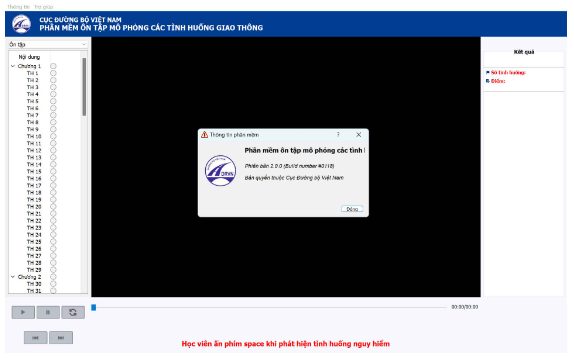 - Sau khi kết thúc 10 tình huống hệ thống sẽ hiển thị kết quả: từ 35 điểm trở lên là ĐẠT, dưới 35 điểm là KHÔNG ĐẠT.